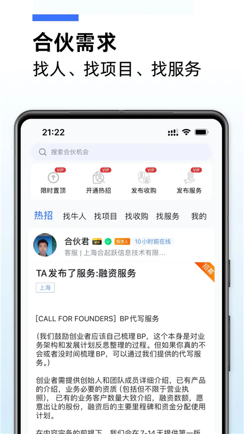 爱合伙app是一款寻找创业合伙人的手机平台,主要功能包括智能推荐合伙、发布创业项目、高端社交名片等,采用阿里巴巴人脸识别系统,对用户进行实人认证,并对用户的职业经历和教育背景进行认证,支持企业法人和股东身份的验证,提升用户的透明度和专业度,通过创业标签筛选,系统智能分析用户画像,为创业者极速推荐优质合伙人,轻松拓展人脉。
