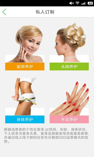 1.私人订制:根据消费者的个性化需求,以性别、年龄、身体状况、个人诉求等为基本元素,量身订制服务项目或服务套餐,并通过线上线下即时应答充分展现O2O运营模式的优势。