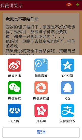注册成功的用户还可以将自己喜欢的笑话进行上传,审核通过后会在APP的相应功能上显示出来;此外APP使用者还可以对喜欢的笑话进行多平台分享,比如可以分享至微信朋友、微信朋友圈、新浪微博、腾迅微博、qq好友、qq空间 、人人网、开心网及支付宝好友。