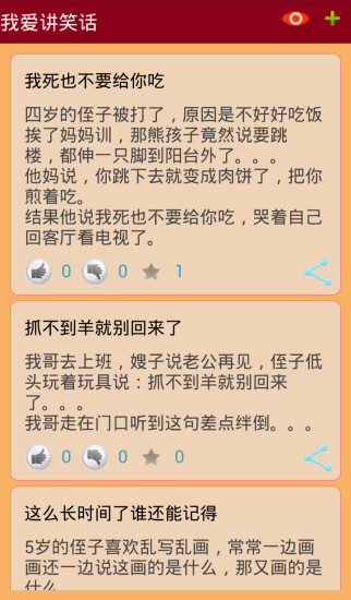我爱讲笑话app是一款笑话阅读类手机软件,这里包含了海量笑话资源,包括校园笑话、职场笑话、儿童笑话、成人笑话、家庭笑话、冷笑话、糗事大全等,用户可以收藏和分享自己喜欢的笑话,让生活每天乐开怀,喜爱的朋友赶快到绿色资源网下载体验吧!