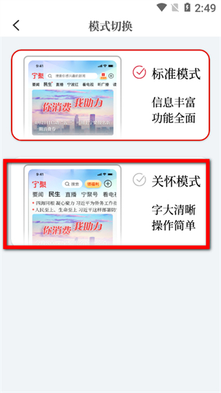 4、在模式选择页面,选择关怀模式,即可开启宁聚app的关怀模式。