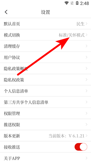 3、在设置页面,点击模式切换选项,进入模式选择页面。