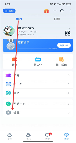 1、打开115网盘APP,进入我的页面,点击设置选项。