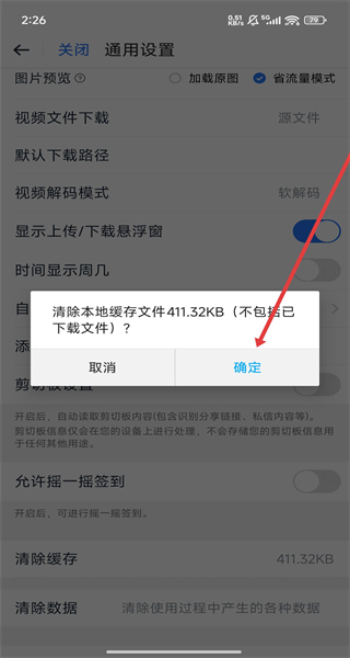 4、通用设置页点击清除缓存,在弹窗中点击“确定”,完成缓存清理。