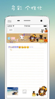 2.日记: 写下每一份触碰心灵的感受,记录点滴生活。60张精美信纸,emoji表情,日记配图,让一切都显得如此美丽生动。