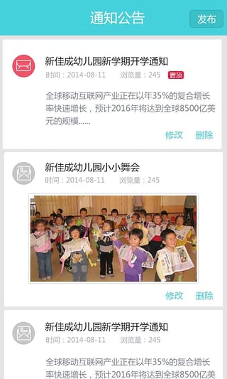 园方通过管理平台向客户端实时发布通知公告,家长即时掌握园方动态,方便、高效、快捷、环保。