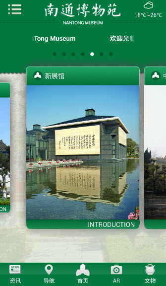 南通博物苑,作为中国第一座公共博物馆,首次通过APP的形式,将“馆园结合”的独特风格搬上指尖,用实景导航、历史复原等技术手法带领游客进入 全新的参观导览模式,步入新馆、中馆、南馆、北馆、东馆以及张謇故居——濠南别业,观赏珍稀古树、中草药植被;除通过文、图、声、影形式介绍最 新展览、馆藏文物、展厅参观外,还通过二维码扫描、语音编码查询、园区景点自助导览定位、水印相机等互动功能为游客提供更便捷的参观服务。