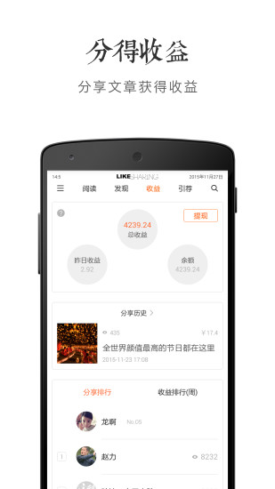 4.分享收益:每次您分享喜欢的文章给好友,我们都乐于根据阅读量为您提供一定奖励,并希望借此打造一个全民阅读的小世界。