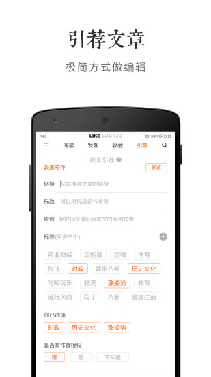 2.自由编辑:您尽可以挑选自己喜爱的文章,一键分享至我们的平台,在这里,您可以自由体会编辑个人报刊的乐趣。