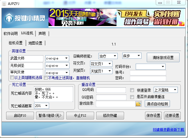 3、本次更新选择英雄选择召唤师技能卡住问题。后面更新看情况。win8用户没有启动按钮的请按F10启动F12停止。