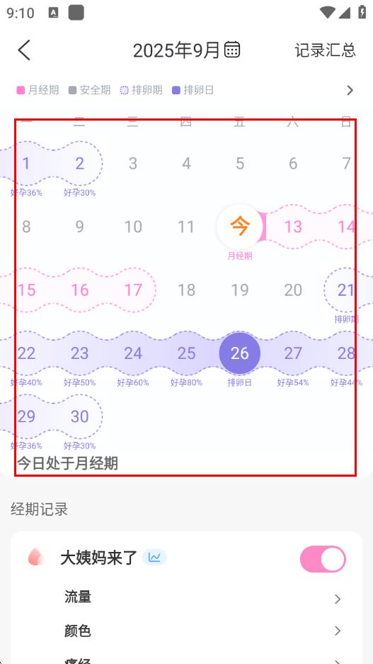 4、保存后,即可在日历页面查看经期、安全期、排卵期等相关记录。