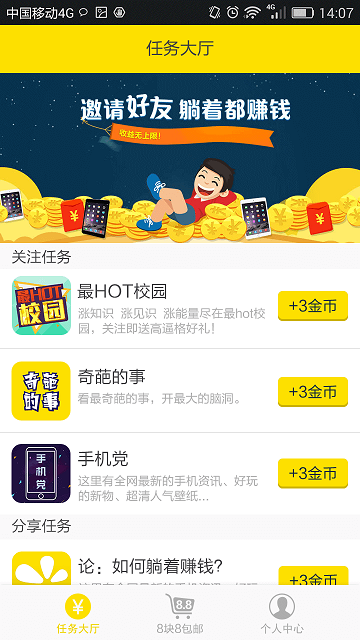 纷享呗是一款能轻松赚钱的APP,利用用户闲置的社交媒体资源,通过众包的模式调动用户主动关注公众号、分享图文到社交媒体,完成任务后用户能获得一定的金币,金币能兑换现金。通过邀请好友,坐享好友任务收益的分成10%,该分成由平台支付,让你躺着也能赚钱!同时精选淘宝全网超低折扣的优质商品,8块8包邮,确保优质低价,省心省钱!
