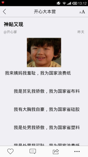 开心大本营app是一款笑话阅读软件,为用户提供了丰富的幽默搞笑内容,只要你打开开心大本营,定能让你抛去烦恼和忧愁,缓解压力,每一天都有好心情。快来下载体验吧!