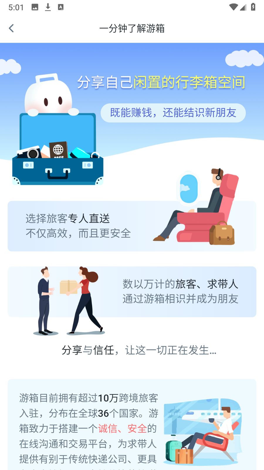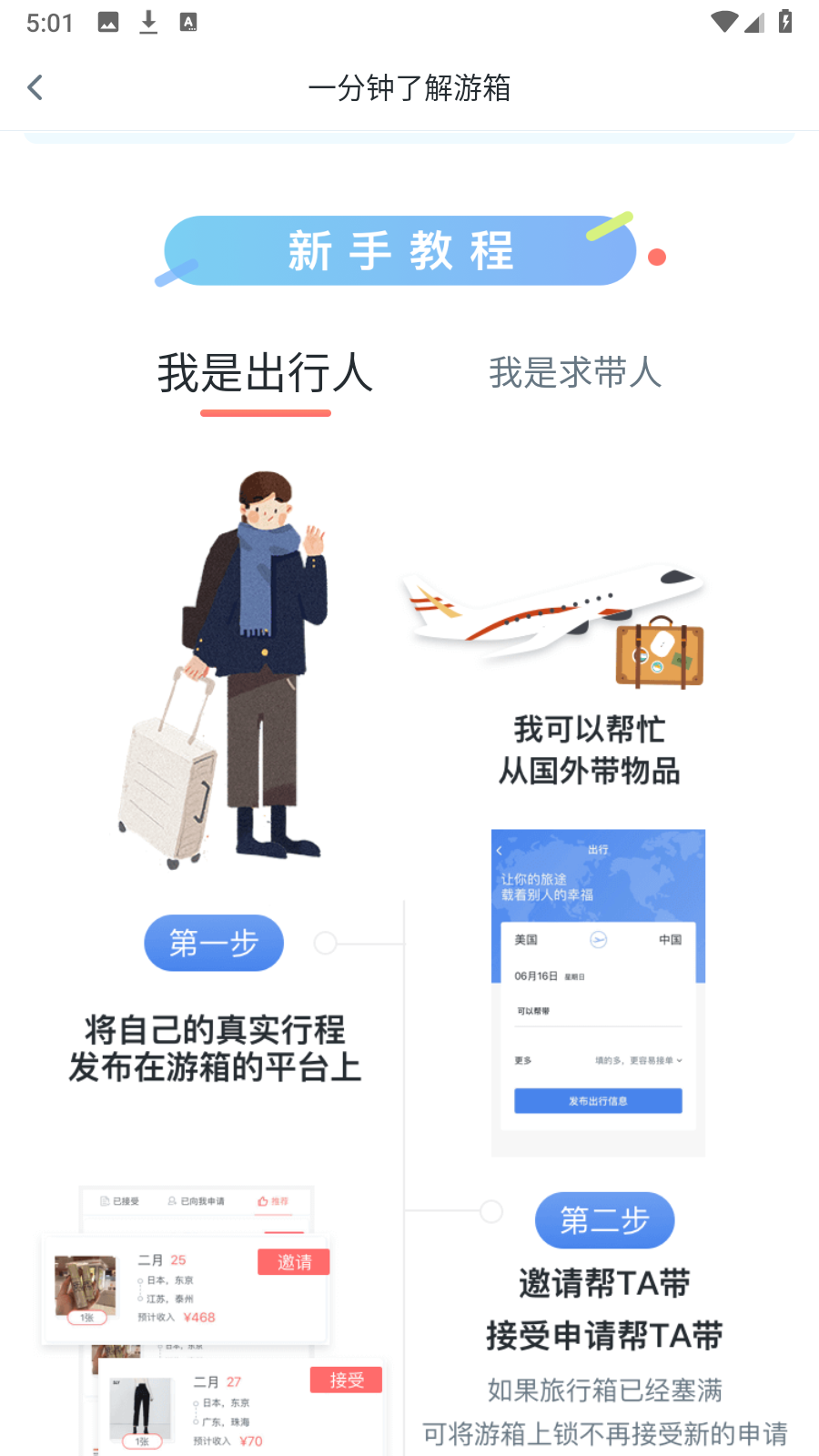 在游箱上,出行人的每一个行程都有价值。出行人可以选择更方便、更喜欢的寄件请求。订单完成后,出行人可对寄件人进行评价。游箱希望遇到热爱生活,热爱分享的你。