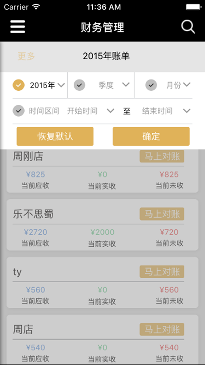 1、财务管理,可以随时查看一段区域内的财务账单,直接在线进行对账