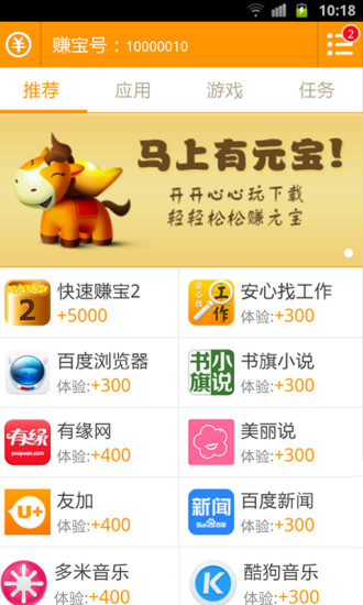 任务形式多种多样,用户可以通过下载各种APP进行体验,下应用玩游戏赚积分,机会多多,赚宝多多。