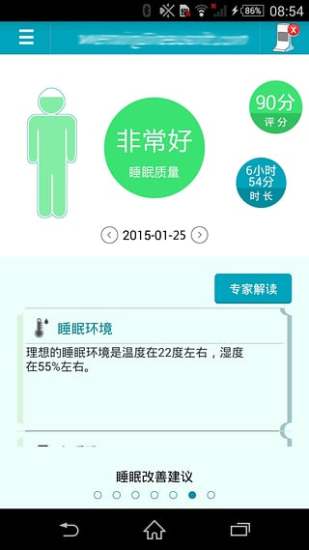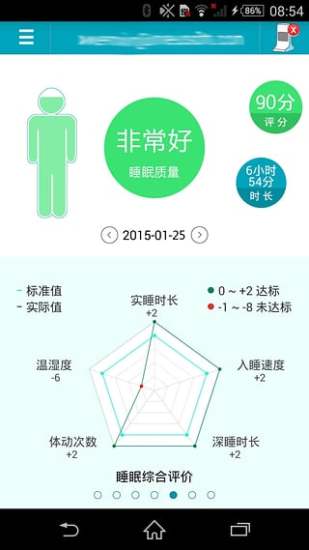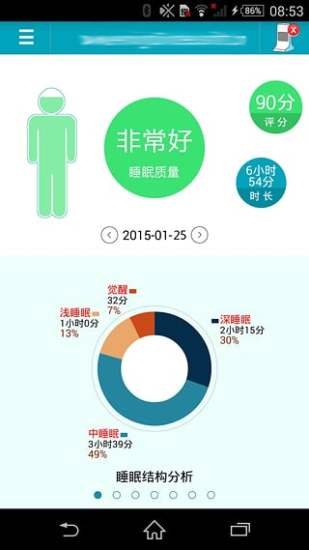 全面的睡眠评分体系,参考您的年龄、性别、环境、睡眠阶段等等因素,并通过对比海量的睡眠数据,计算出您每天晚上的睡眠质量得分,评价您的睡眠质量,了解您现在的睡眠健康水平。