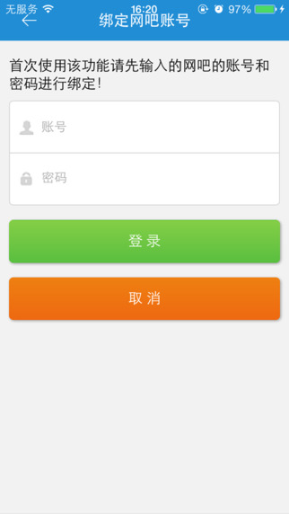 如果您是第一次使用,则扫描二维码后会弹出绑定界面,需要先绑定您在该网吧的上网账号和密码后,才可以使用。