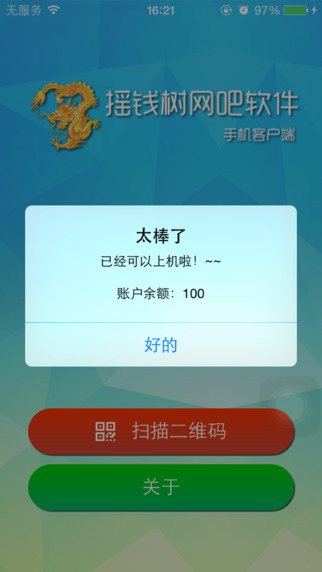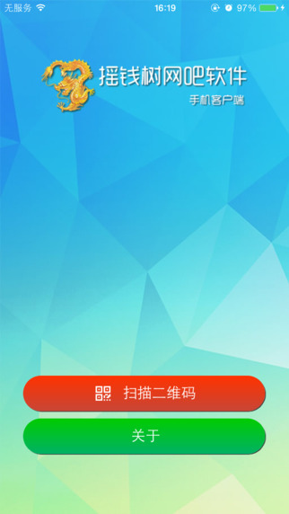 您到装有摇钱树网吧管理软件的网吧上网时,打开手机客户端,点击“扫描二维码”对着网吧客户机锁屏界面上的二维码扫描一下,即可直接登录!