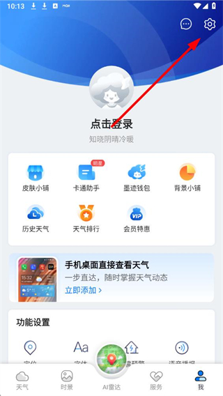 1、在墨迹天气应用我的页面,点击右上角的设置图标,进入设置功能界面。
