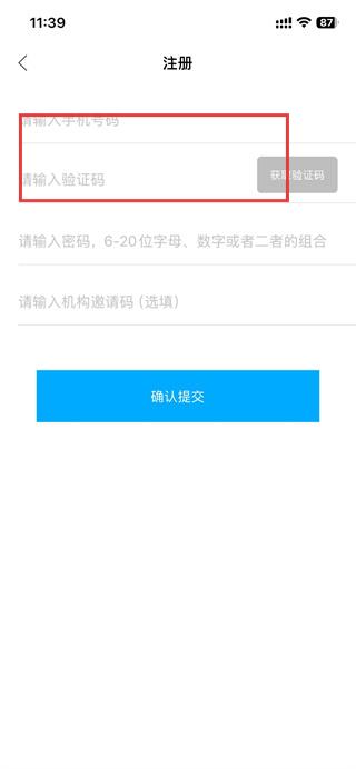 3、在注册页面,输入手机号和接收到的验证码。