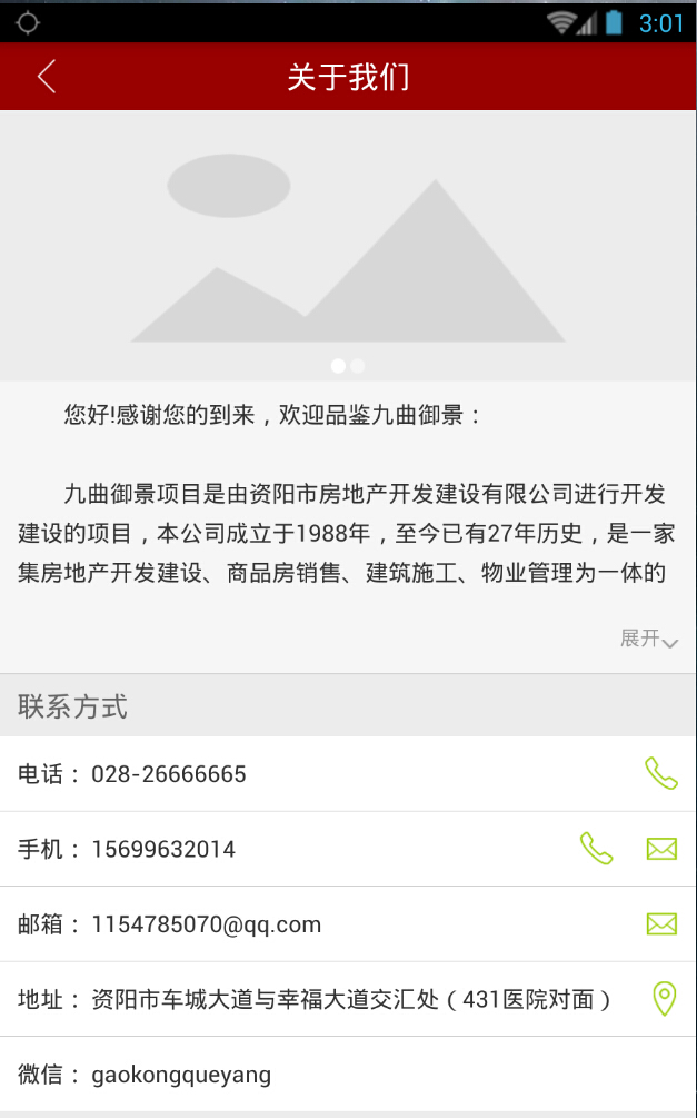 资阳房产app是一款由资阳市房地产开发建设有限公司推出的一款能够方便客户更加快捷的了解其旗下的楼盘信息的手机应用,除了能够了解其详细的楼盘信息,还能查看楼盘户型图,百度地图定位等功能,让客户不用到售楼处也可以全面的了解楼盘,也是一款不错的信息展示平台,欢迎需要的朋友来下载体验!