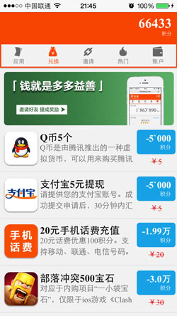 ■ 支付宝提现、Q币、手机卡等多种兑换