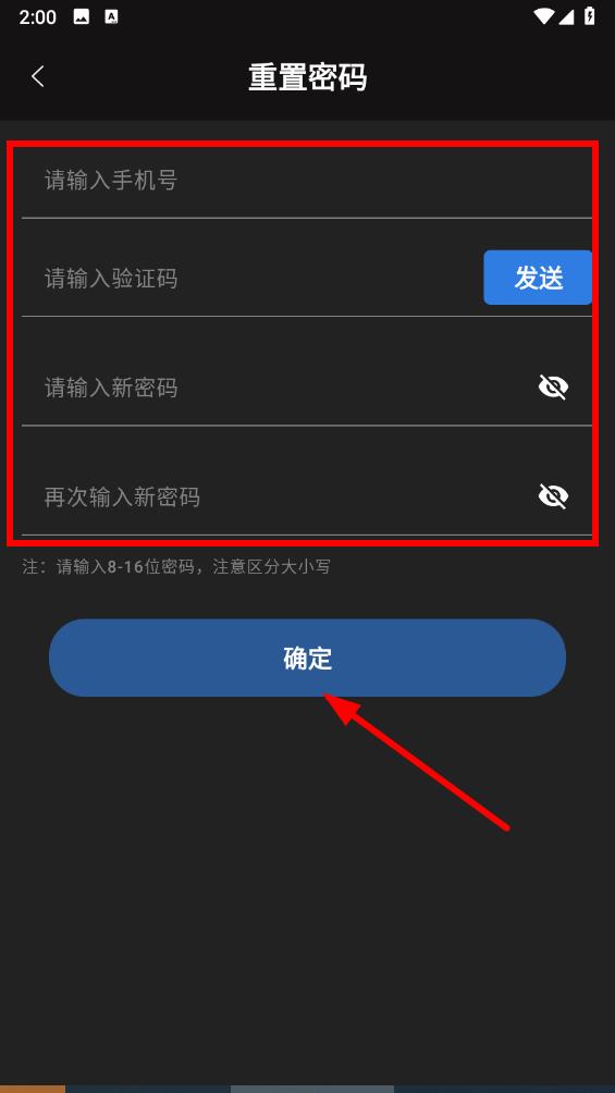 4、在重置密码页面,依次输入手机号,获取验证码,接着设置新密码,最后点击确定,完成密码修改。