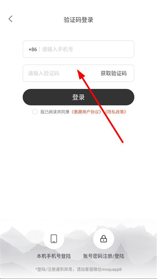 4、在验证码登录界面输入手机号,点击获取验证码并填写收到的验证码,勾选协议后点击登录完成操作。