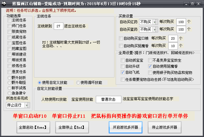 画江山熊猫辅助是一款画江山多开辅助工具,让你在一台电脑上可以运行多个游戏客户端,多种不同的任务说明,一键升级打怪,自动做任务刷脚本,同时还有其他的辅助功能,喜欢就不要错过!