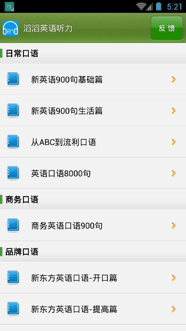 滔滔英语听力涵盖《新英语900句基础篇》、《新英语900句生活篇》、《从ABC到流利口语》、《英语口语8000句》、《商务英语口语900句》等日常生活口语,商务口语、品牌口语一样都不缺,更多更丰富的教材不断补充中,精心的设计和编排,引导学习者走进具体生活场景,让你在每个细小的场合都有语可循,充分熟悉衣、食、住、行,每个情景都有精心收集日常用语,英语由专家朗读,语音纯正地道,音质清晰。