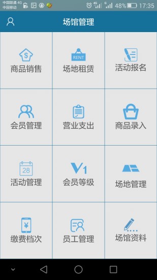 内含员工管理、会员管理、商品销售、场地管理、活动管理、支出管理等功能