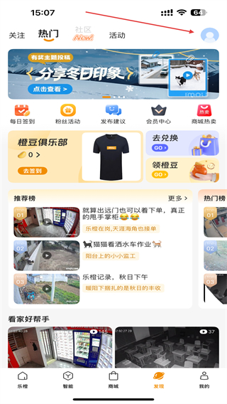 1、打开乐橙监控的应用,在首页右上点击头像的图标。