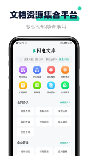 闪电文库是手机上的模板制作工具,为大家带来超多类型的模板使用,每个小伙伴都可以找到自己所需要的,简单的操作一键制作模板,还有专业资料随意查询使用,做大家手机上的文档资源集合平台,大大提高你的使用效率。