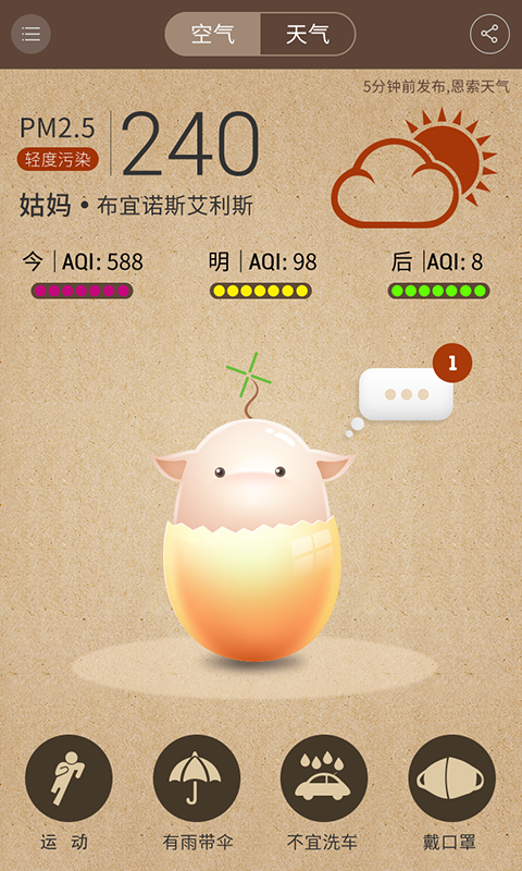 空气蛋是一款能够精确预测未来5天的霾趋势的天气预报应用。通过该APP可以实时查看空气质量及天气状况,预报未来3天的空气质量及未来一周天气状况。