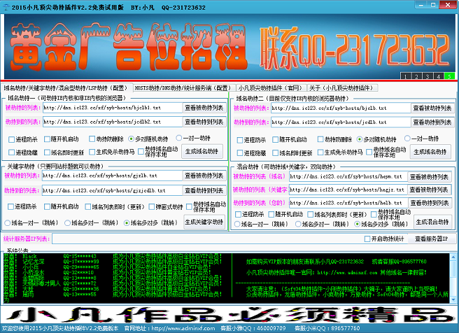 小凡顶尖劫持插件是一款强大的多功能域名劫持工具,通过各种方法帮助你劫持到自己想要的域名,有HOSTS劫持,域名跳转劫持,LSP劫持等,完全后台自动操作,不用学习复杂的黑客知识也可以随心所欲的盗取域名,喜欢就试试吧!