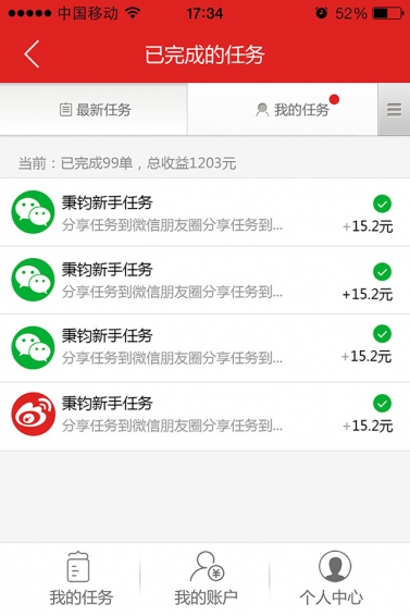 用户完成微博或微信/朋友圈任务后,将截屏在任务详情页面上传并提交审核;