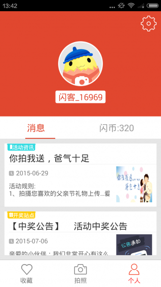 用于用户账户信息管理及积分查询, 每期有主题活动,拍照参与即可获得相应积分,积分越多,惊喜越大,神秘好礼拿到手软。同时可方便查看“爱闪拍”最新活动信息及中奖公告等系统消息。