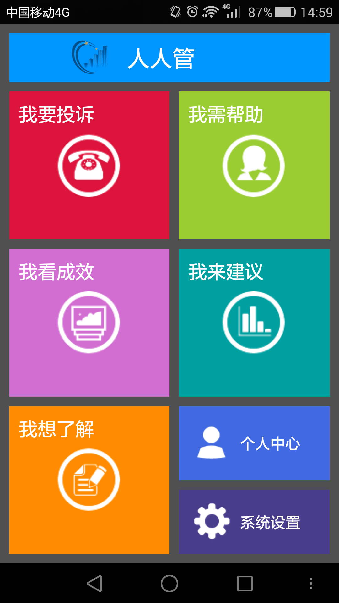 温州智慧城管中心推出的“人人管”app提供了“我要投诉”、“我需帮助”、“我看成效”、“我想了解”、“我来建议”五大功能模块,它将是市民整体在线生活战略中重要的组成部分之一,也是公众参与城市管理的新方式。