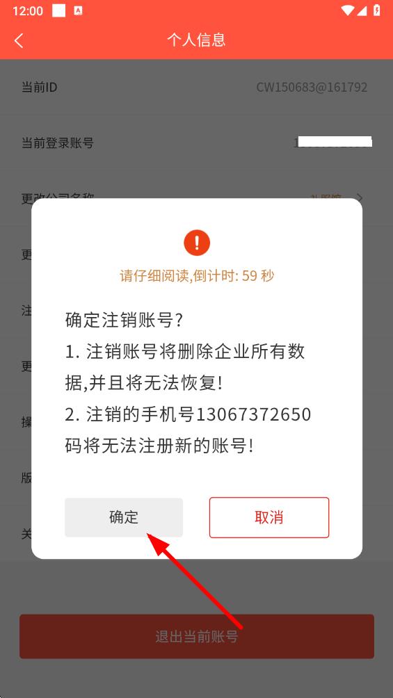 4、仔细阅读注销提示,了解注销账号会删除企业所有数据且注销手机号无法再注册新账号,倒计时结束后点击确定完成账号注销。