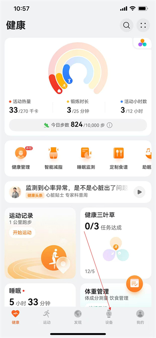 1、在华为运动健康的健康页面,点击底部设备选项,进入设备管理页面。