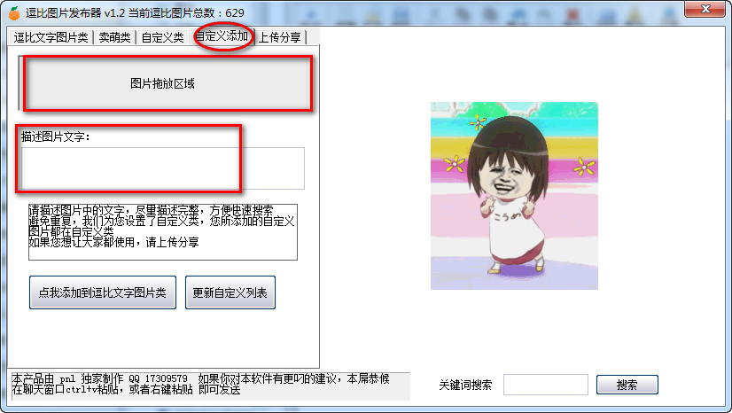 3、自定义添加,可自己制作属于你的图片表情,只需把图片拖到指定区域,加上描述的文字,就可直接添加到逗比文字图片类。