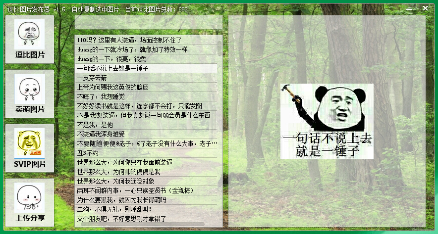 逗比图片发布器相当于一款逗比图片制作工具,该工具收录了大量的陡壁图片,每次看见朋友们聊天发的各种逗比的搞笑图片会想这些图片都是哪里来的,今天看到这款逗比图片发布器才明白,原来逗比图片生成这么简单容易。逗比图片发布器可以自己DIY逗比图片,还能查看其它网友分享受的图片也可做为自己的表情图片发送给好友。
