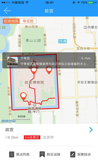 景区内导航,景点及服务设施查询; 专属的景区地图,让您方便快捷找到自己想去的景点, 离您最近的服务设施,比如最近的卫生间应如何到达