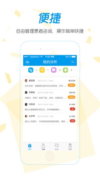 3.我的诊所:医生可对就诊的患者自由进行管理、查看病例、在线咨询解答、健康追踪等,帮助医生科学、便捷地管理和服务患者。
