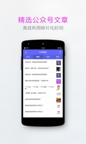 头条精选app是一款及高质量阅读类手机软件,这里精选了优质的微信文章和高质量热门新闻,并且含有贴心的多国语言翻译,让你一机在手,轻松知尽天下事,喜爱的朋友赶快到绿色资源网下载体验吧!