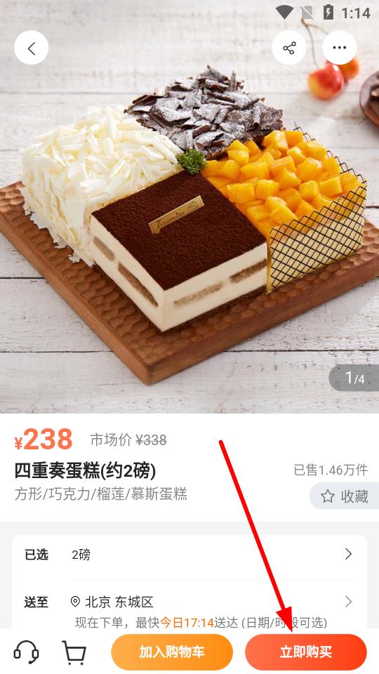 4、进入所选蛋糕的详情页,确认蛋糕规格等信息后,点击立即购买或加入购物车,并按后续提示完成支付和订单确认操作。