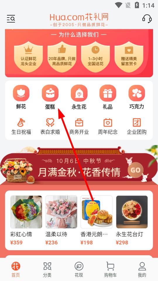 1、打开花礼网app,在首页点击蛋糕选项进入蛋糕选购页面。