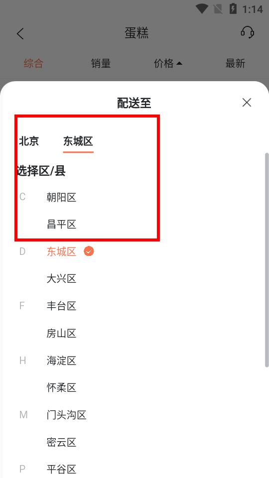 2、在蛋糕页面上方,点击配送至选项,选择具体的配送地区,比如北京东城区。