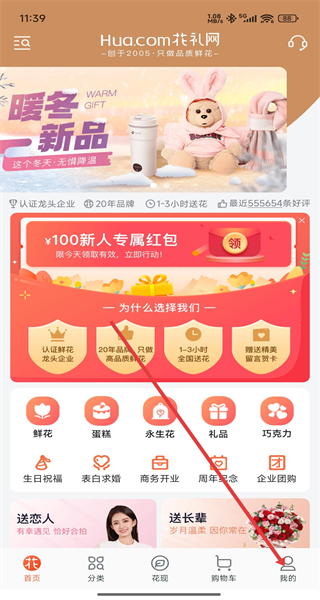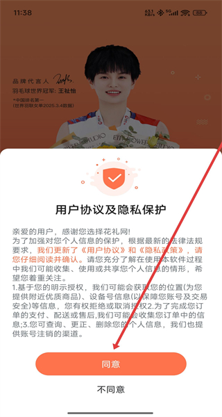 1、在打开App后,通过点击弹窗中的同意按钮,进入花礼网首页。